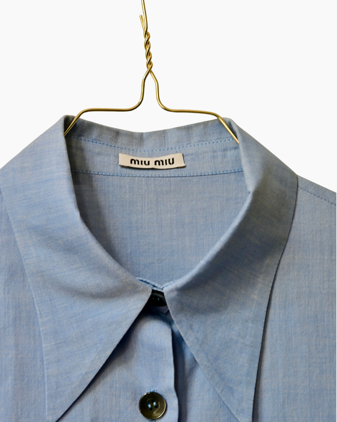 Miu Miu, Prada’s playful sister, loves to twist classics. From the late 90s into the 2000s the house brought back the dramatic 70s dagger collar and kept revisiting it in later collections. This piece captures that mix of Y2K ease and retro polish: a simple poplin shirt made special by a bold collar.